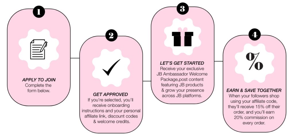 The JB Ambassador Program is designed for artists who live and breathe lashes — creators, educators, and community leaders who love JB LASHES and want to grow their influence, elevate their craft, and connect with a brand that truly supports them. Earn 20% cash commission on every sale with your exclusive discount code shared to followers!