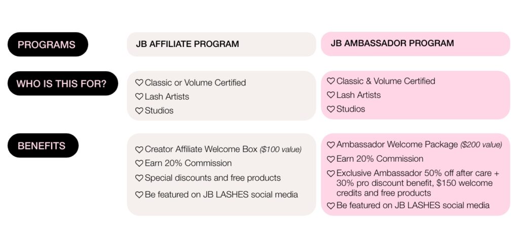 - Ambassador Welcome Package — Receive a curated welcome box valued at $200, featuring JB LASHES essentials to support your content and artistry.Â